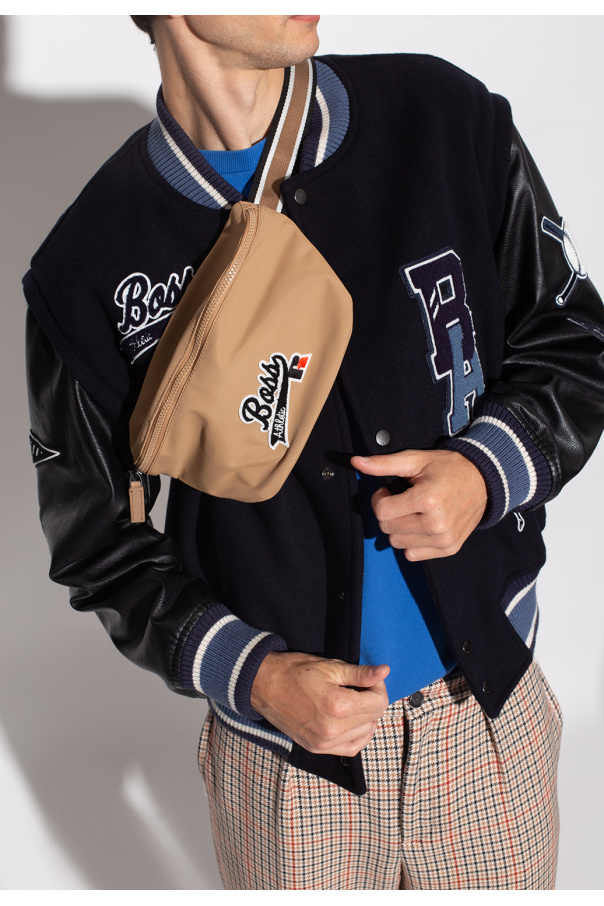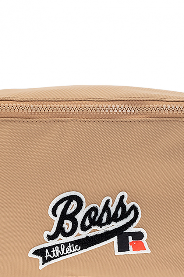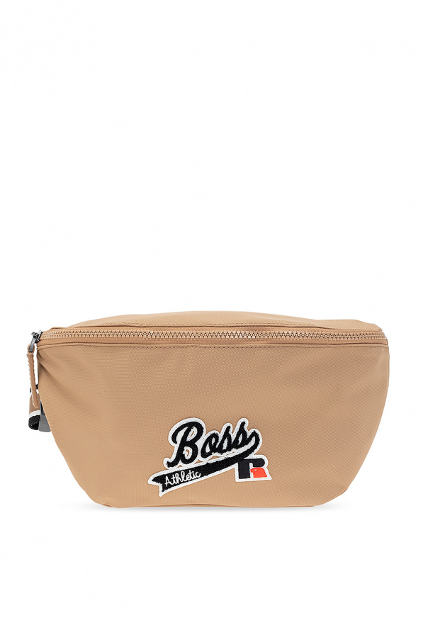 Beige belt bag from BOSS x Russell Athletic. Crafted from structural nylon made of recycled fibers, this item features a zip fastening and is complete with a black, white and red logo patch, adjustable belt, black metal hardware and one internal compartment with one slip pocket.