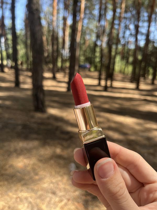 Помада красивого красно-розового оттенка. На разных тонах кожи или освещения может отливаться в фуксию или же коралловый. Помада матово-кремовая, приятная в нанесении и по текстуре