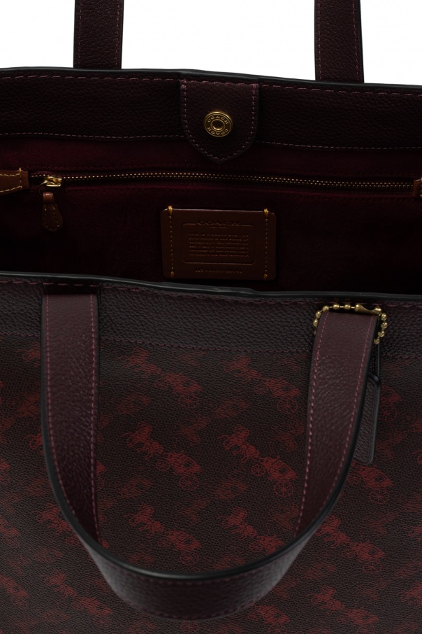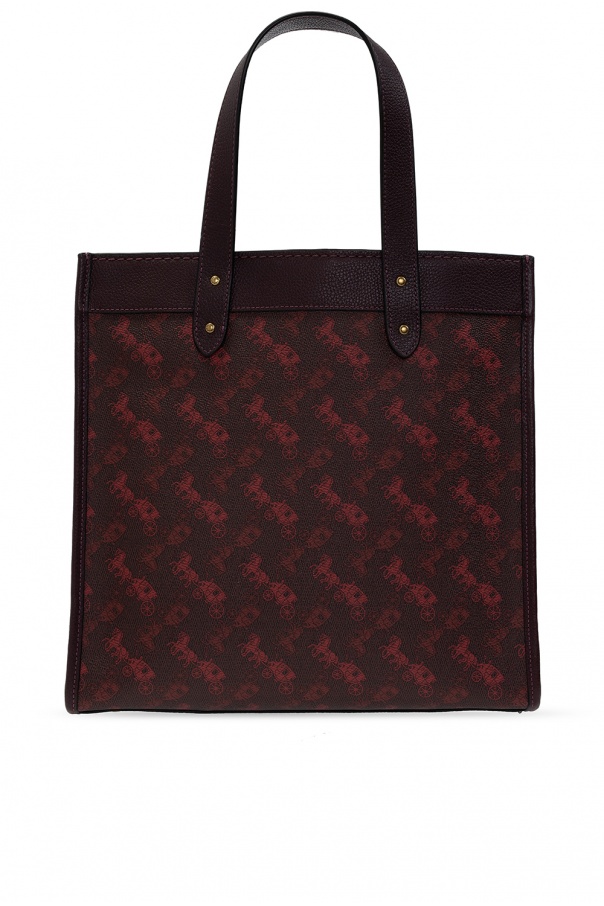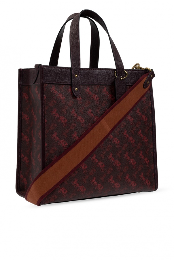 Purple and maroon 'Field' shopper bag from Coach. Crafted from leather and canvas donning the brand's iconic print, this design fastens via snap-button and employs two half-round handles, exposed stitching details, a detachable and adjustable shoulder strap, gold-tone metal hardware and interior with one compartment and one zipped pocket.
