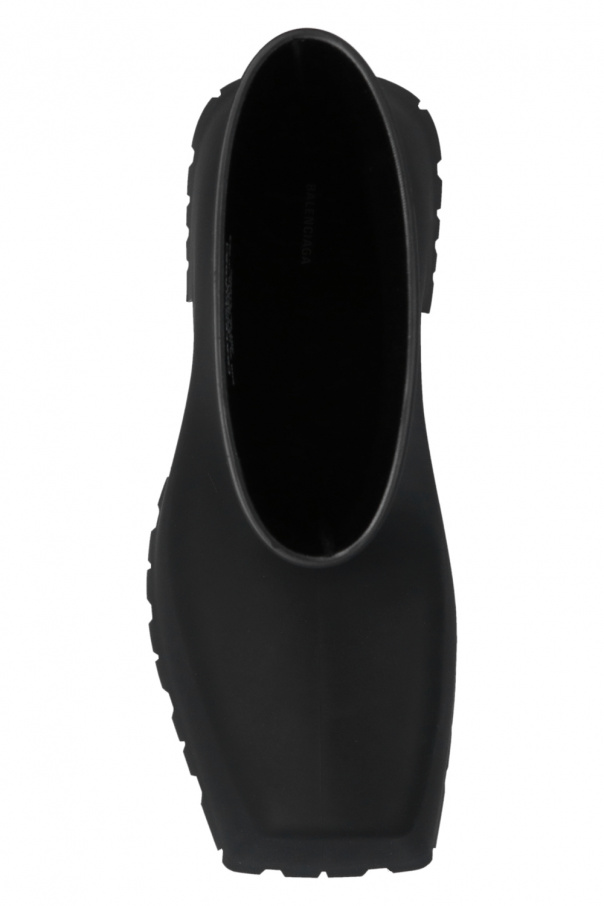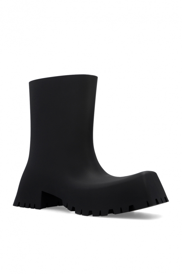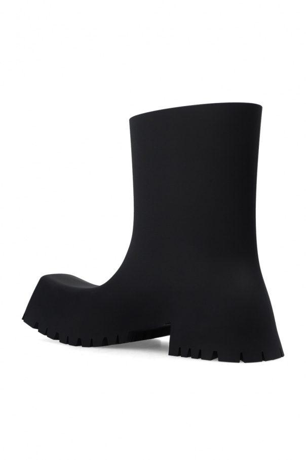 Black ‘Trooper’ rain boots from Balenciaga. Designed for rainy weather, this model features a square toe and a black rubber sole.