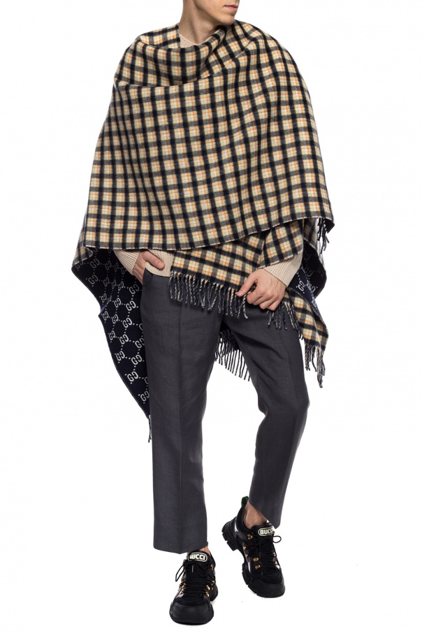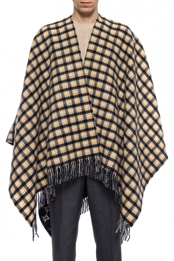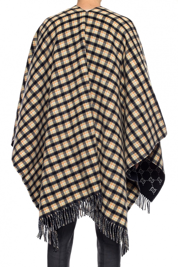Navy blue and white poncho from Gucci. Made of wool. Embellished with woven check pattern and GG motif in orange, cream and green. Finished with fringes.