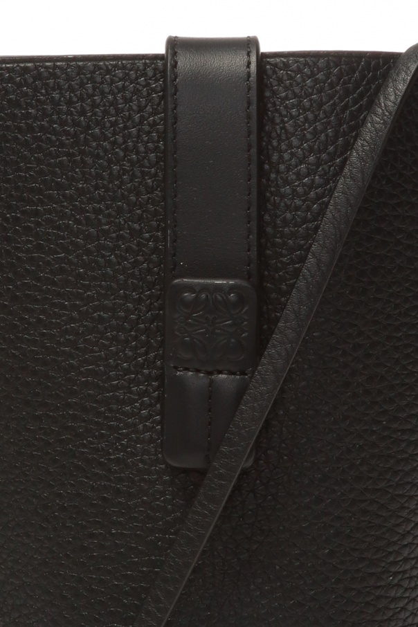 Black phone case from Loewe. Made of leather. Fastened via snap-button on strap. Embellished with an embossed logo. Features slip pocket on the rear, a half-round handle on an adjustable strap and interior with 1 compartment.