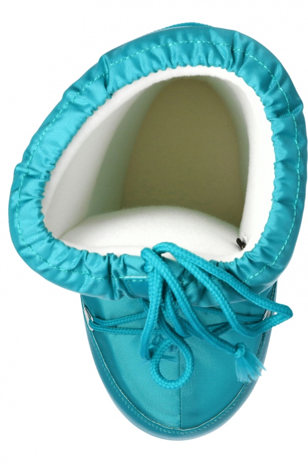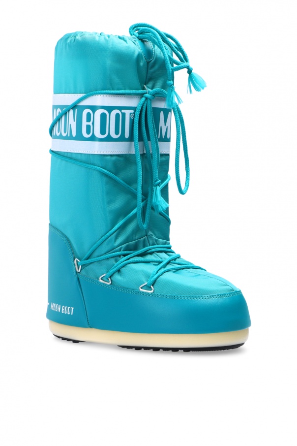 Blue ‘Nylon’ lace-up snow boots from Moon Boot. This high-top design features a logo print, silver-tone metal hardware and a rubber sole in black and beige. Inspired by the peculiar shape and technology of the astronauts’ boots, the iconic style was designed in 1969 after the first Moon landing.