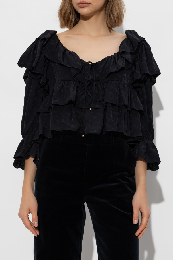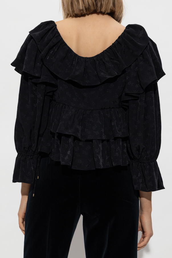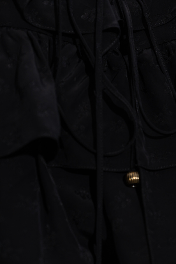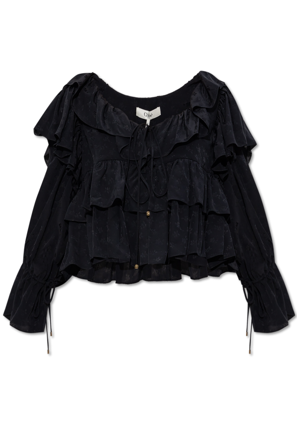 Embrace the epitome of elegance with the Chloé Floral Top, an exquisite piece from the exclusive collection. Crafted in a deep, rich black color, this top showcases a romantic and feminine style, perfect for sophisticated occasions. Designed with a loose fit adorned with cascading ruffles, this garment offers a voluminous silhouette that exudes charm. The delicate fabric, made from 100% viscose, features subtle floral motifs, adding a touch of sophistication and allure. The neckline is embellished with a tie-string accented by golden beads, while the long sleeves mirror the ruffled detail, enhancing the top’s luxurious appeal. This piece is an embodiment of Chloé\'s visionary design ethos, celebrating both timeless elegance and contemporary femininity. Why Choose This Product? Crafted from lightweight, luxurious 100% viscose. Features elegant ruffles for a sophisticated look. Decorated with gold-accented drawstrings at the neckline. Designed by Chloé, a paragon of Parisian fashion.