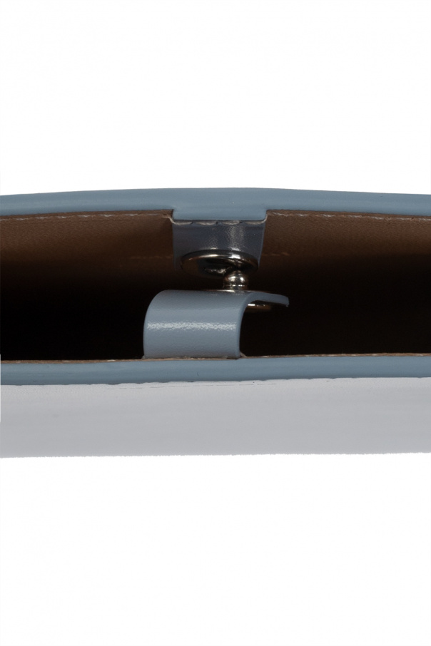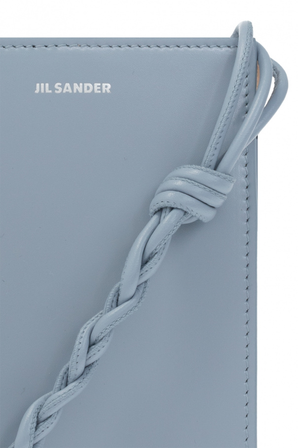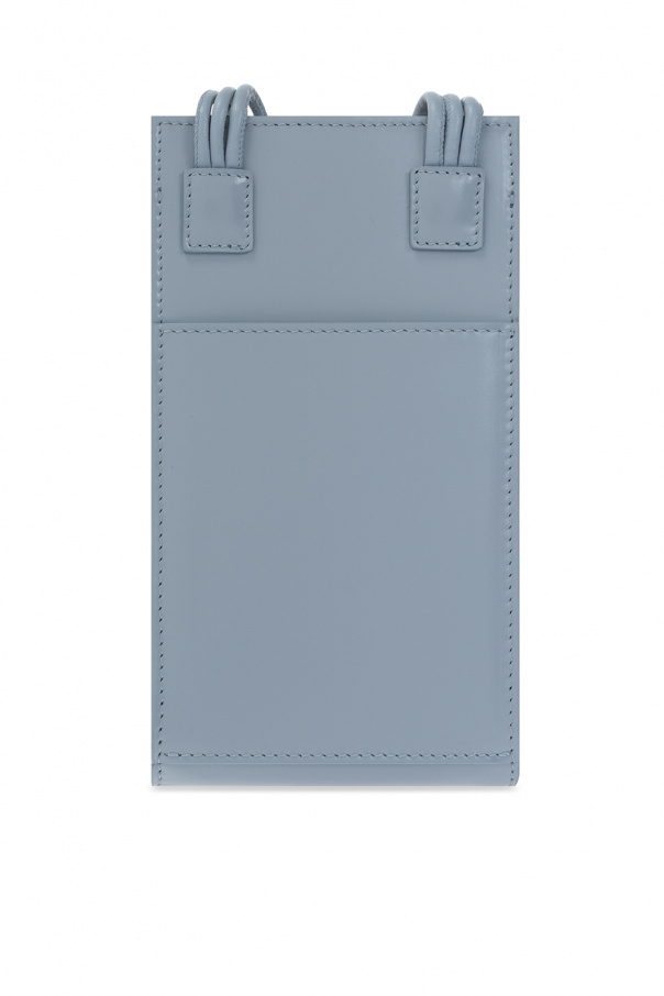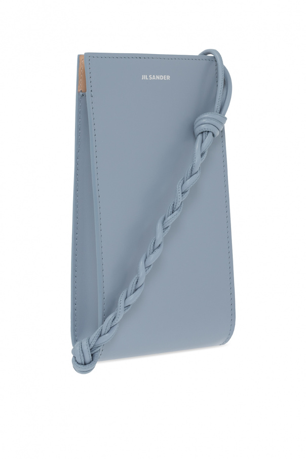 Greyish-blue phone holder from Jil Sander. Crafted from calf leather and lamb leather, this design secures with a snap and showcases a silver-tone logo detail, a back slip pocket, a hand-woven shoulder strap, silver-tone metal hardware and a beige-clad interior.