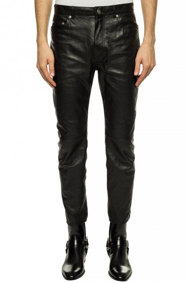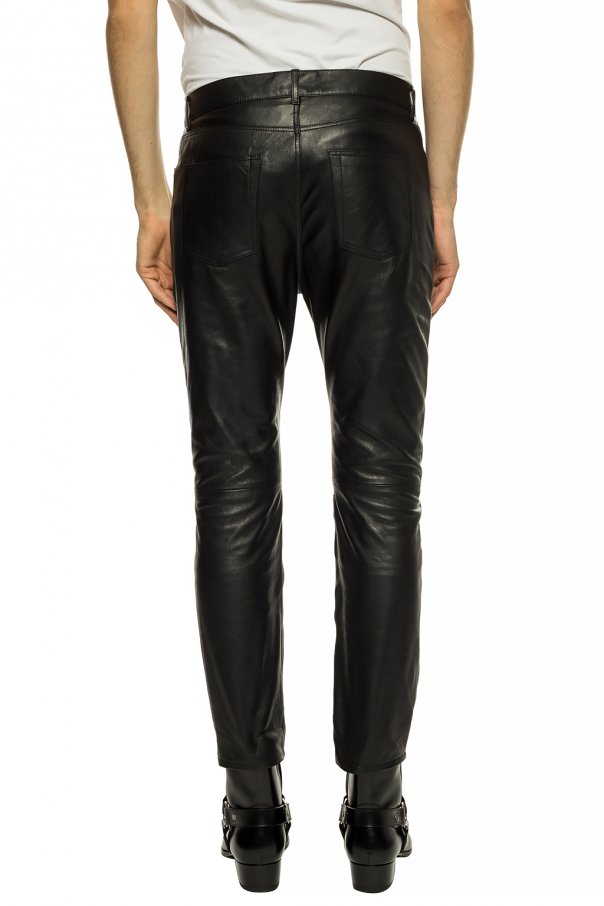 Black trousers from Saint Laurent. Made of leather. Fastened via zip and button. Feature 4 slip pockets and tapered legs.