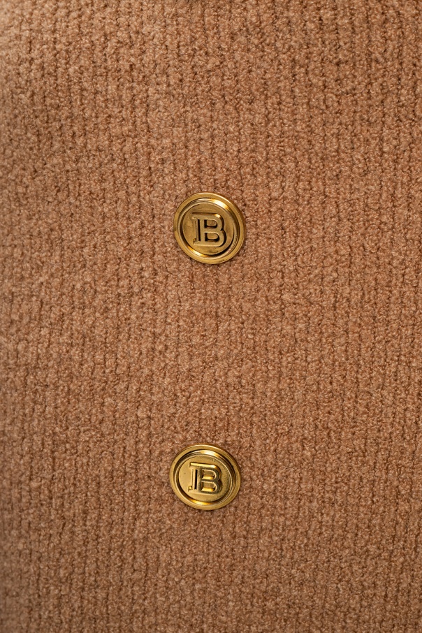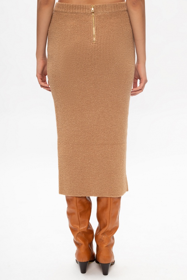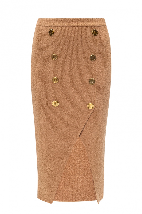 Beige skirt from Balmain. Boasting distinctive gold-tone buttons which were embossed with the label\'s logo, this style is complete with a back zip fastening and a vent.