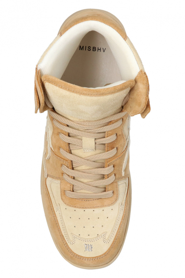 Beige and cream ‘Court’ high-top sneakers from MISBHV. Crafted from suede, this pair features a tribal pattern in cream, metal appliqué in silver-tone, raised logo in black and a rubber sole in beige.