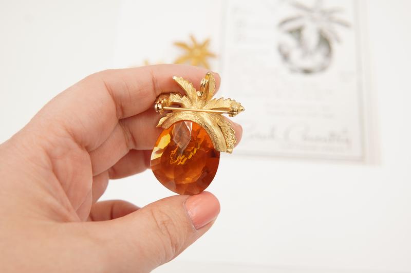 Основная часть брошки сформирована из огромного граненого стеклянного камня янтарного цвета, который блестяще сверкает на свету. Листья ананаса изготовлены из матового золотого металла и имеют высокую детализацию.