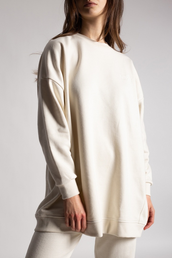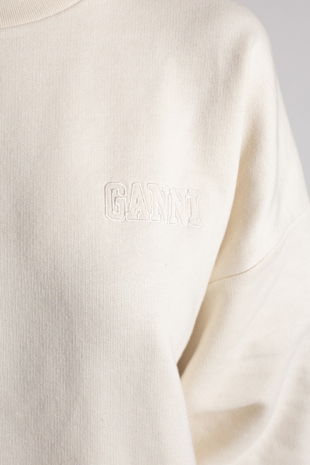 Cream crewneck sweatshirt from Ganni. Crafted from recycled polyester and organic cotton, this long-sleeved design features an embroidered logo pattern in cream and ribbed trims at the neck, hem and cuffs.