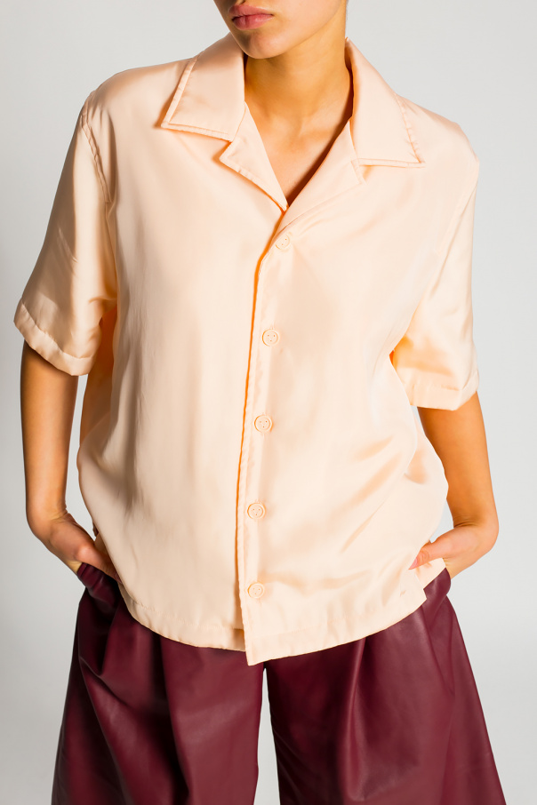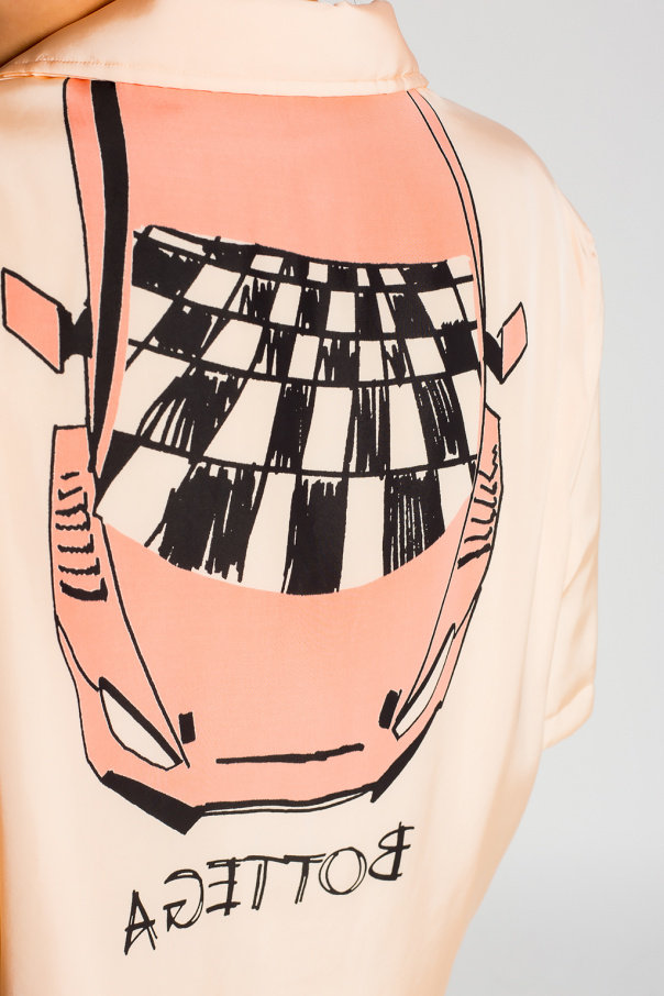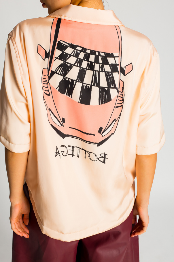Light pink shirt with short sleeves from Bottega Veneta. Fastened with buttons, this design features side slits and a multicolored logo print at the back.