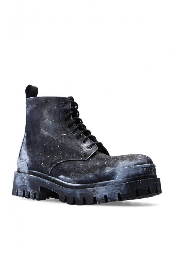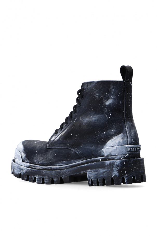 Black ‘Strike’ lace-up ankle boots from Balenciaga. Enriched by a white paint splatter effect, this pair is complete with a raised logo appliqué and a black rubber sole.