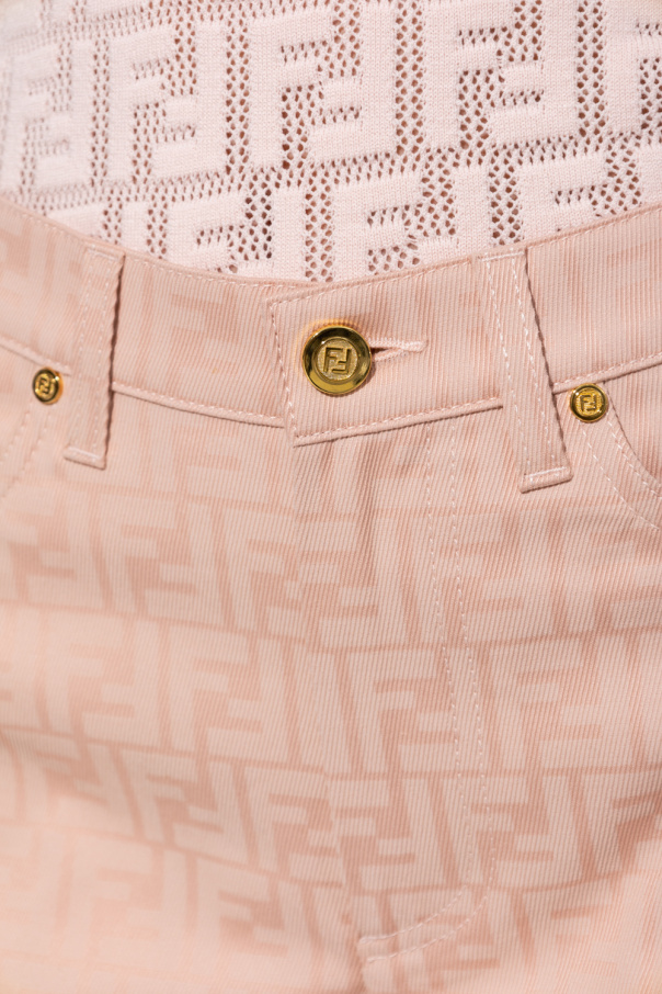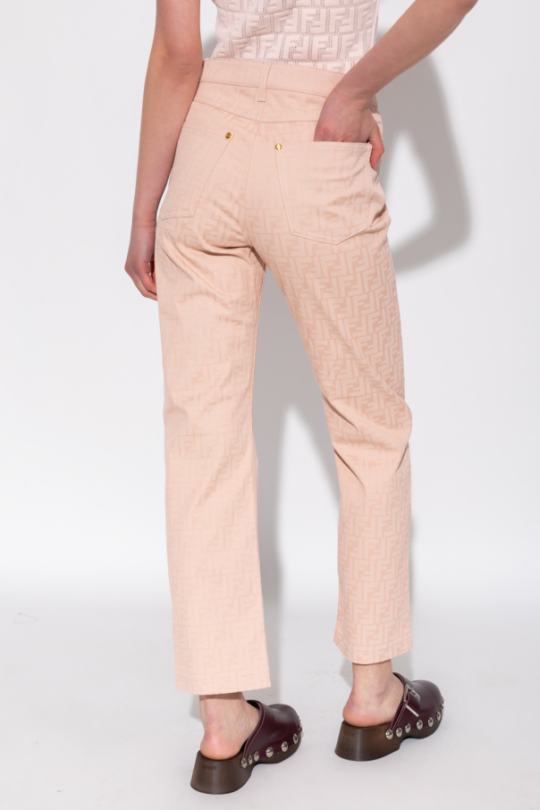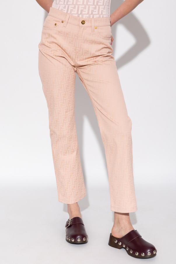 Light pink jeans from Fendi. Embellished with an embroidered FF monogram, this pair falls with straight legs and features a zip fly with a button and classic five pockets.