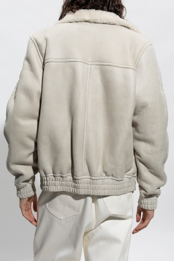 Cream and grey ‘Brett’ shearling jacket from Isabel Marant. Made of lamb shearling, this garment is complete with a zip fastening, two slip pockets and ribbed trims at the hem and cuffs.