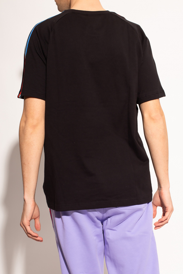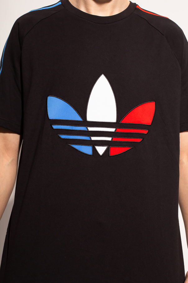 Black crewneck T-shirt from ADIDAS Originals. Made of cotton, this style showcases logo embroidery on the front and the signature stripes in red, white and navy blue on the sleeves.