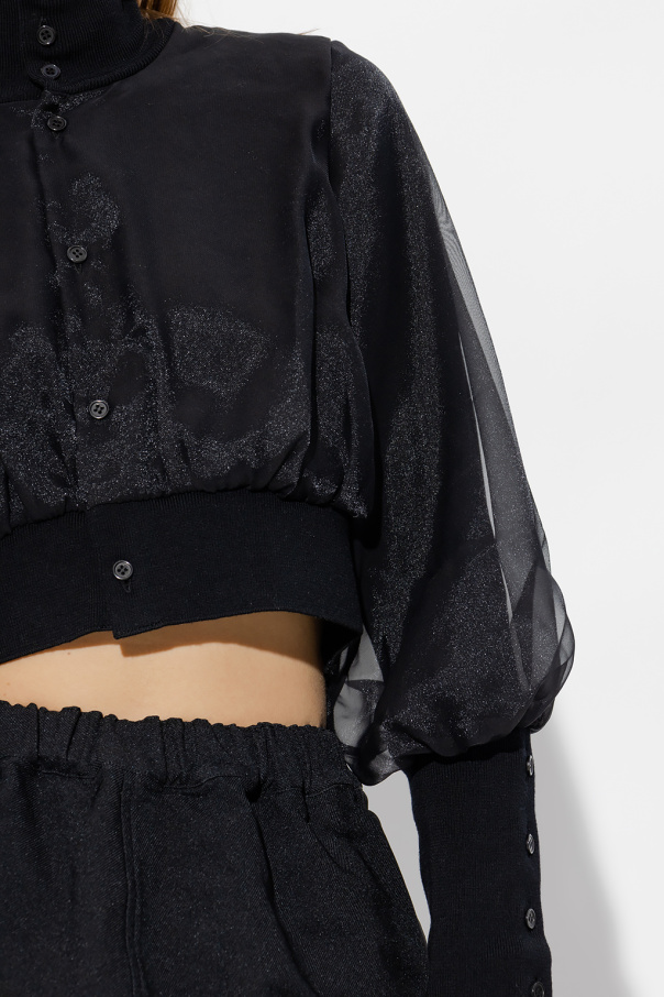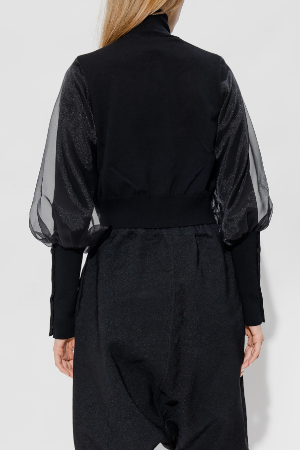 Black sweatshirt with a decorative finish, buttoned high neck and decorative puff sleeves from Comme des Garcons Ninomiya. Made of wool.