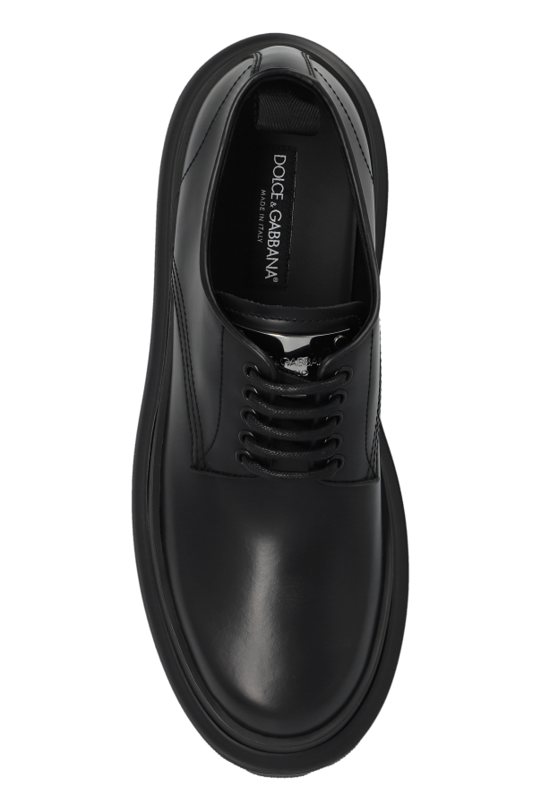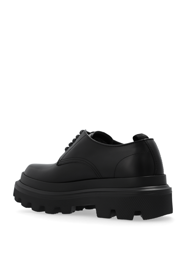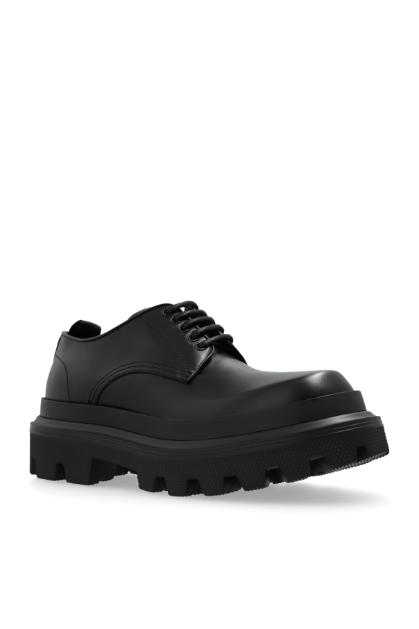 Presenting an exquisite pair of leather men\'s shoes from the renowned designer Dolce & Gabbana. These shoes epitomize sophistication and timeless style, making them a quintessential addition to any gentleman\'s wardrobe. Shape and Design: Featuring a classic derby silhouette with a rounded toe, these shoes boast a smooth upper devoid of unnecessary embellishments, exuding a minimalist and elegant aesthetic. Material: Crafted from premium black leather, these shoes offer both durability and a refined appearance. The thick rubber sole ensures excellent grip and comfort for prolonged wear. Details: The five-eyelet lace-up design allows for a tailored fit, while the tongue proudly displays the Dolce & Gabbana logo, affirming their exclusivity. Sole: The distinctive thick sole with a pronounced tread gives the shoes a modern and slightly rugged look. The all-black sole complements the monochromatic design. Additional Information: These versatile shoes are showcased with an elegant yet casual outfit, highlighting their adaptability for both everyday wear and more formal occasions. Why Choose These Shoes? High-quality leather construction Classic yet contemporary design Exclusive Dolce & Gabbana branding Comfortable and durable rubber sole Versatile for various occasions