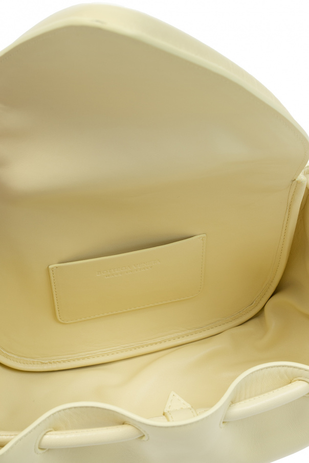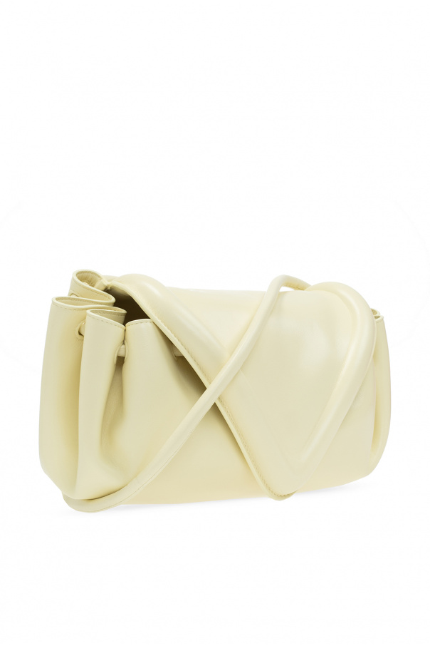 Light yellow \'Beak\' shoulder bag from Bottega Veneta. Size medium. Crafted from lamb leather, this design secures with a magnetic fastener and features an adjustable shoulder strap and one internal compartment with a card slot.