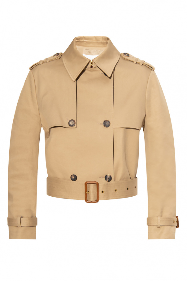Beige and green double-breasted jacker from Michael Kors. Made of cotton with a short length, this item fastens via buttons and features two welt pockets on the front, epaulettes on the shoulders, a cinching belt at the hem and a silk lining.