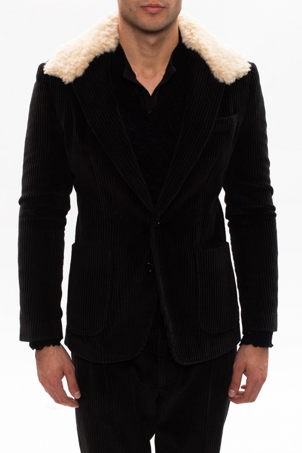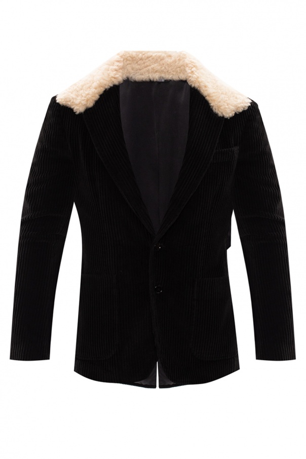 Black corduroy blazer from Dolce & Gabbana. Fastened with buttons, this garment is complete with a beige faux fur collar, two front slip pockets and a single rear vent.