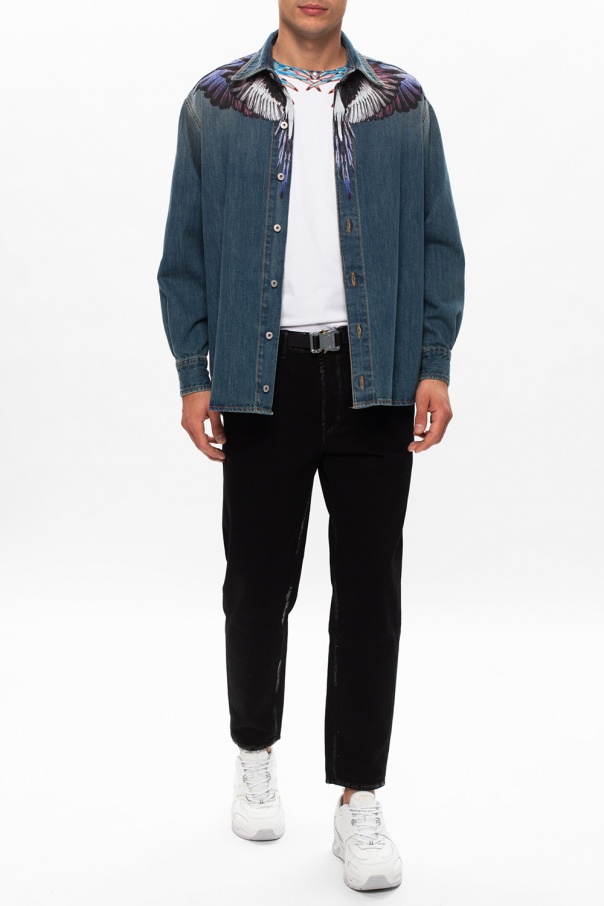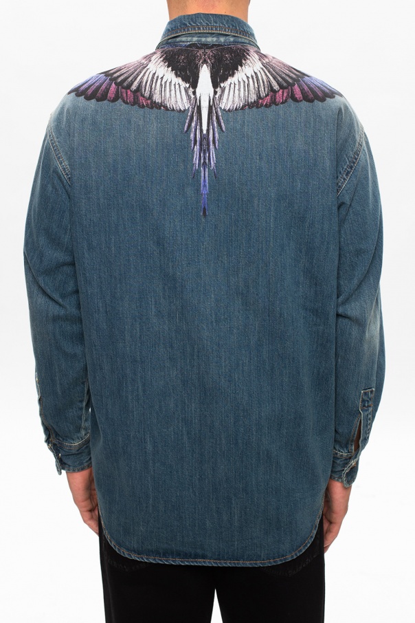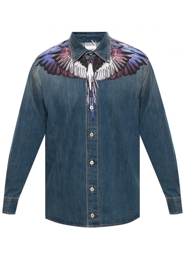 Blue denim shirt from Marcelo Burlon. Illustrated with a colourful graphic print, this style fastens via buttons and is complete with contrasting orange topstitching.