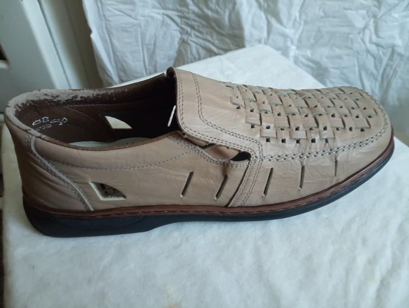 Шкіряні чоловічі туфлі Rieker сезон весна-літо бежевого коліру .Туфли покупались в стоковом магазине новые не подошёл размер.Есть незначительные потёртости кромки задника на фото видно.На внешний вид под брюки не влияет.