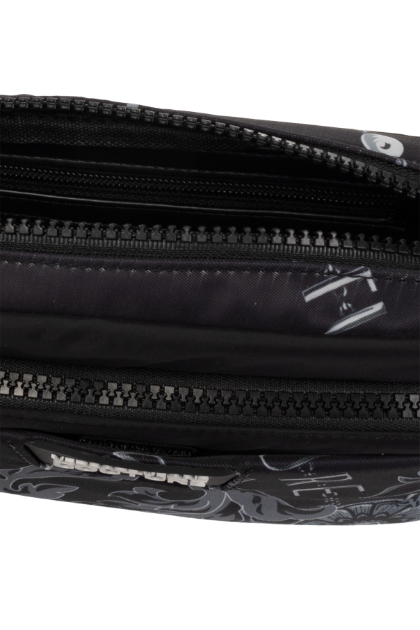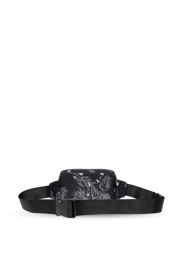Black belt bag from Versace Jeans Couture. Made of fabric, this design fastens with a zip and is decorated with the brand’s signature grey Baroque pattern and a rubber logo detail in white. It is complete with a velcro and a zip pocket on the front, adjustable shoulder strap, black metal hardware and one internal compartment with one slip pocket and one zip pocket.