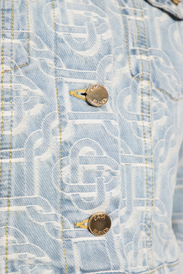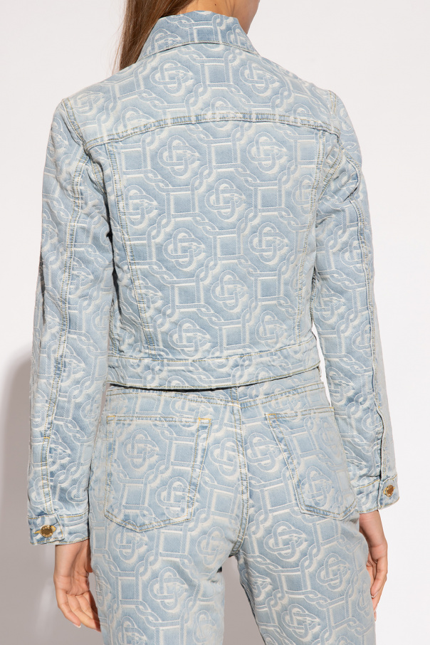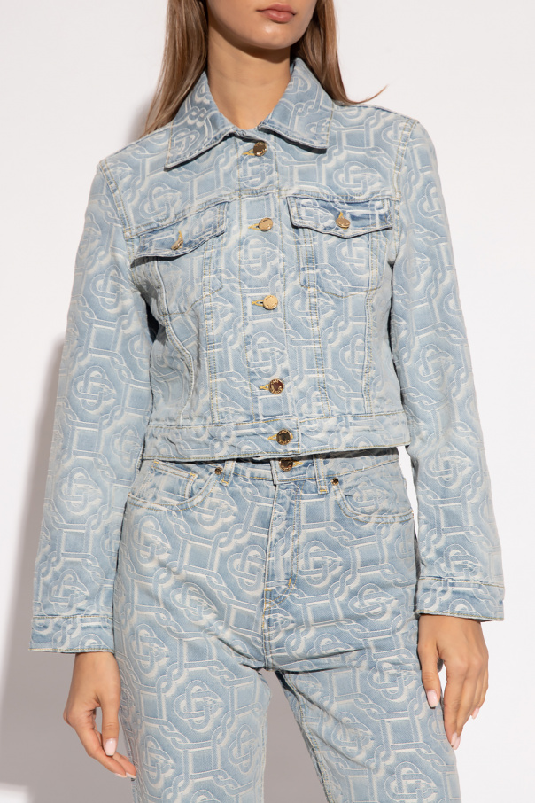 Light blue cropped denim jacket from Casablanca. Fastened with gold-tone logo-engraved buttons, this garment features an embroidered monogram pattern in white, two flap pockets and long sleeves with banded cuffs.