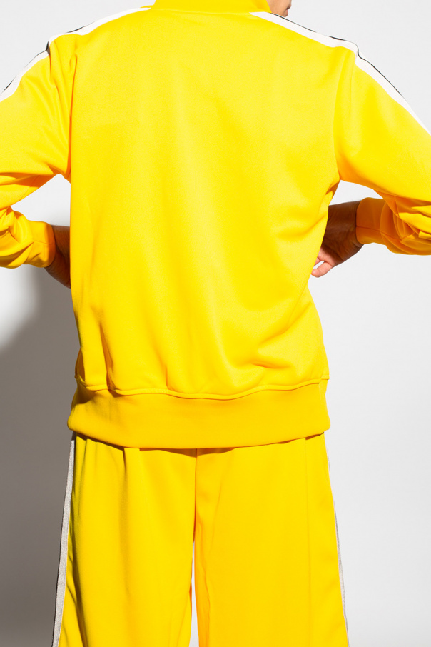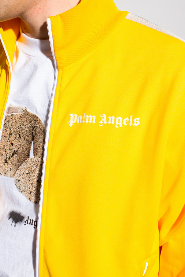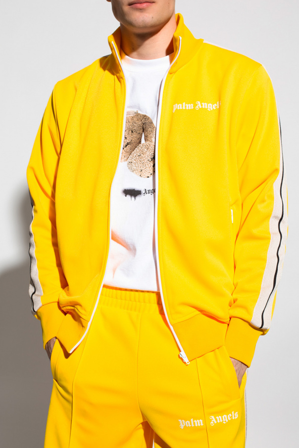 Yellow track jacket from Palm Angels. Fastened with a zip, this garment features a logo pattern, beige stripes, two zip pockets and ribbed trims.