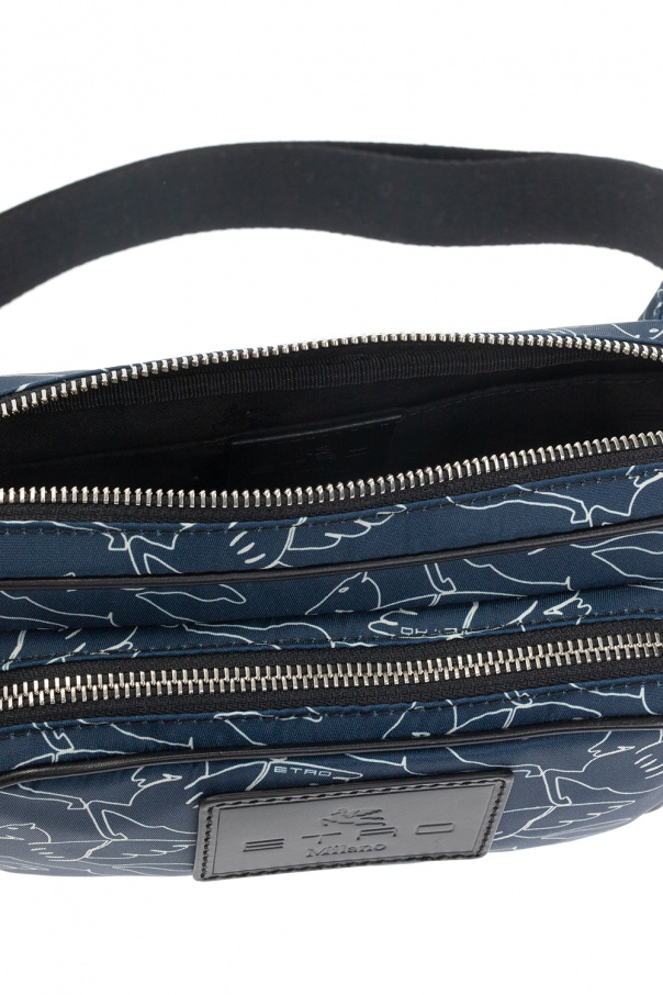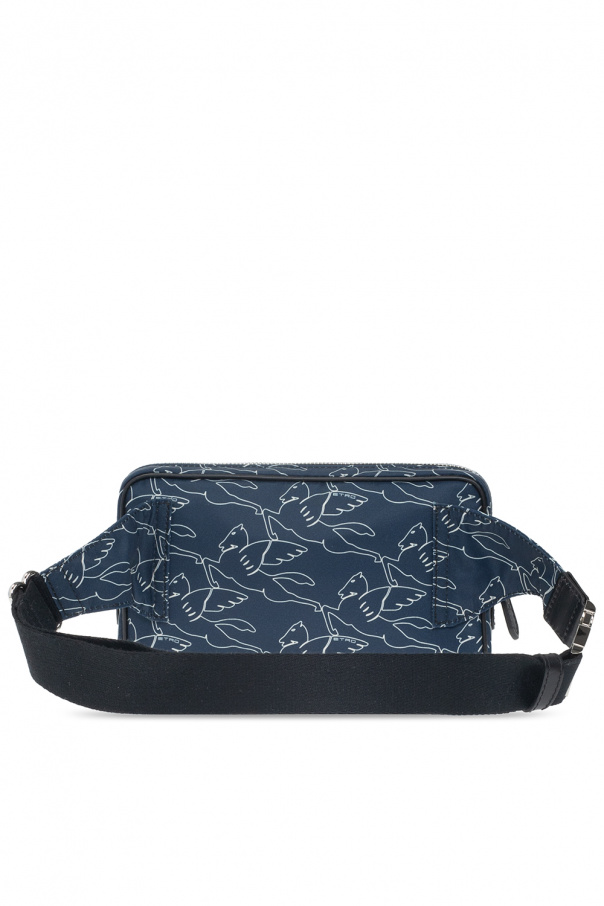 Navy blue belt bag from Etro. Crafted from nylon embellished with a white ‘Pegaso’ motif, this design features a zip fastening, a frontal pocket with a logo-embossed black patch, an adjustable strap, silver-tone metal hardware and one internal compartment with a slip pocket.