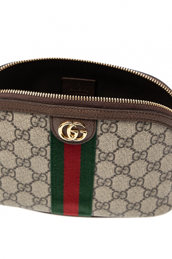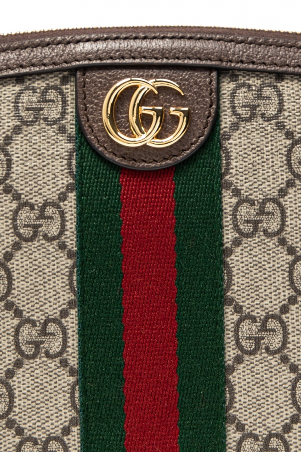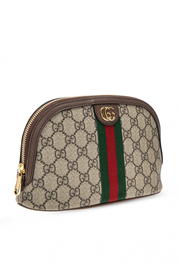 Beige and grey wash bag from Gucci. Crafted from GG Supreme canvas, this item fastens with a zip and is complete with a green-red-green Web stripe and one internal compartment.