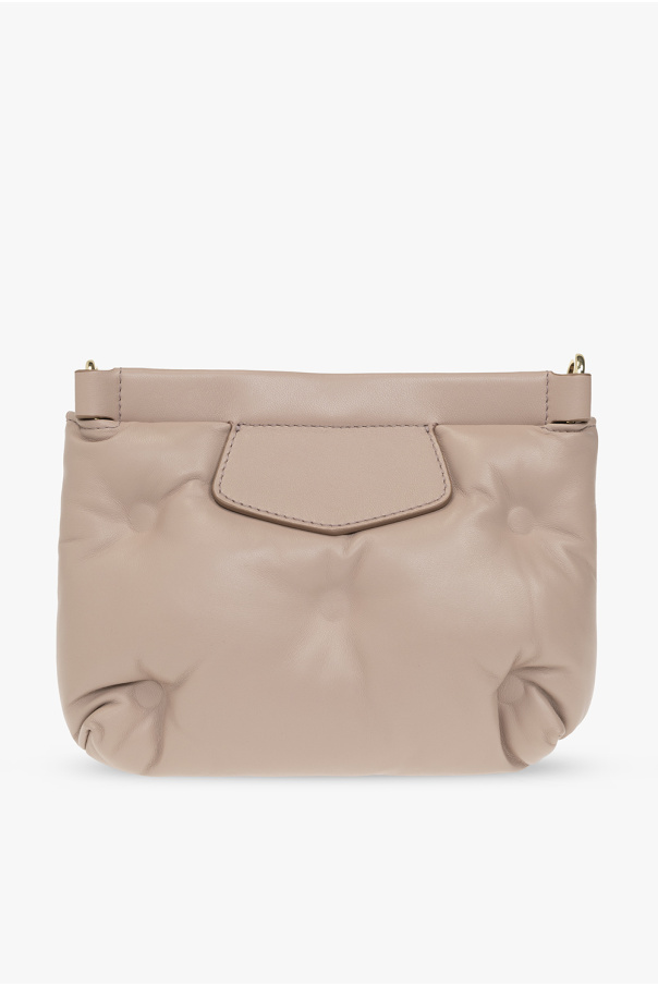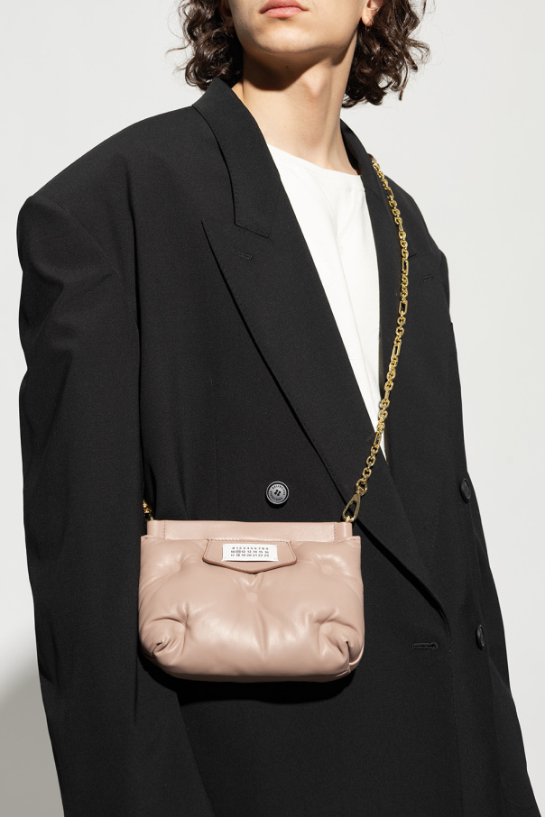 Blush pink ‘Glam Slam Mini’ quilted shoulder bag from Maison Margiela. Made of lamb leather, this model features a magnetic snap, numerical logo in white and black, detachable shoulder chain, gold-tone metal hardware and one internal compartment with one slip pocket.