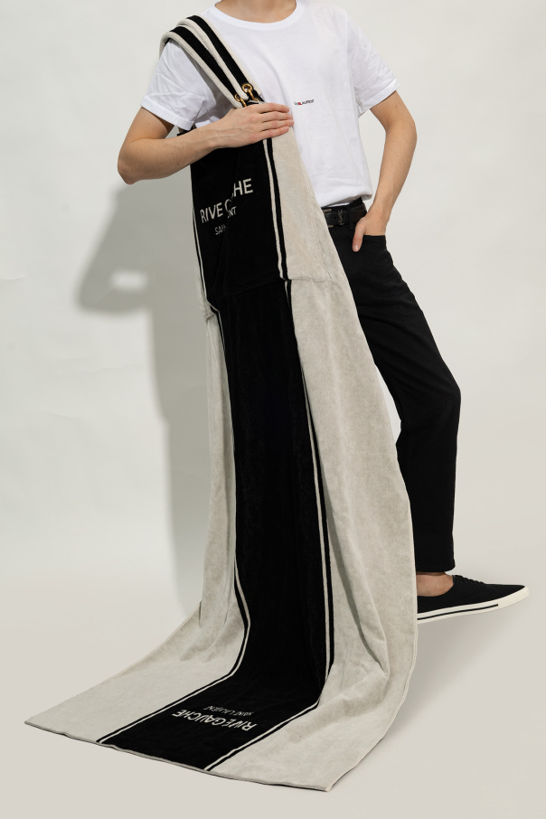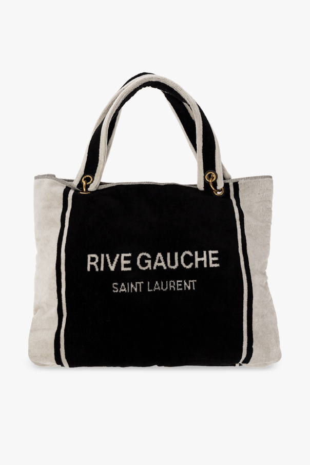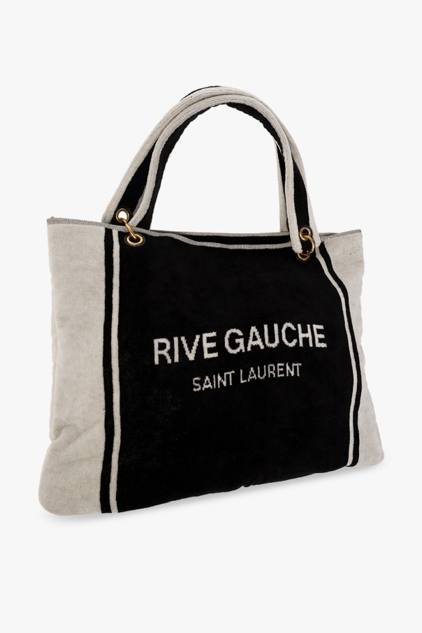 Black and white ‘Rive Gauche’ shopper bag from Saint Laurent. Crafted from fabric, this design showcases the brand\'s logo, two detachable half-round straps, gold-tone metal hardware and one internal compartment with a zip pocket. Can be unfold to use as a towel.