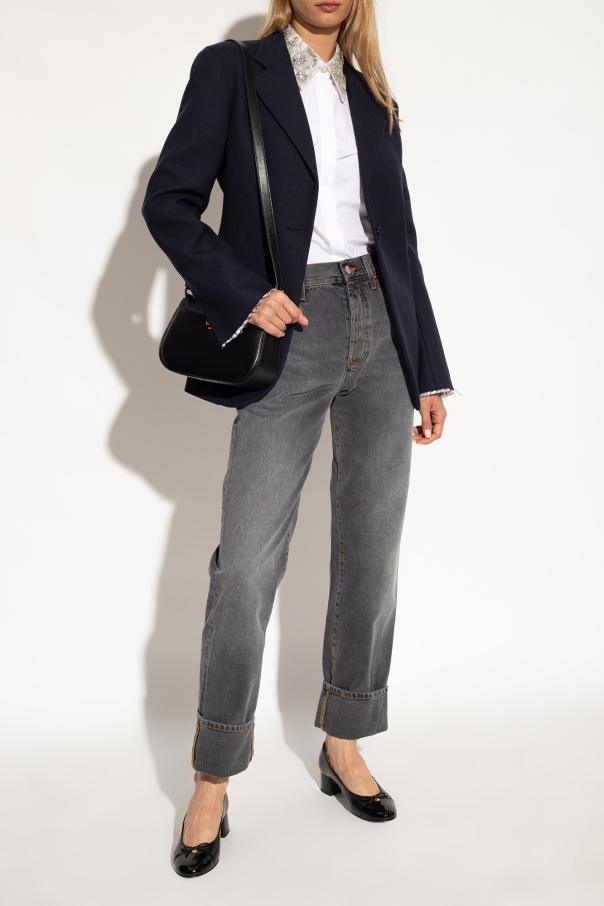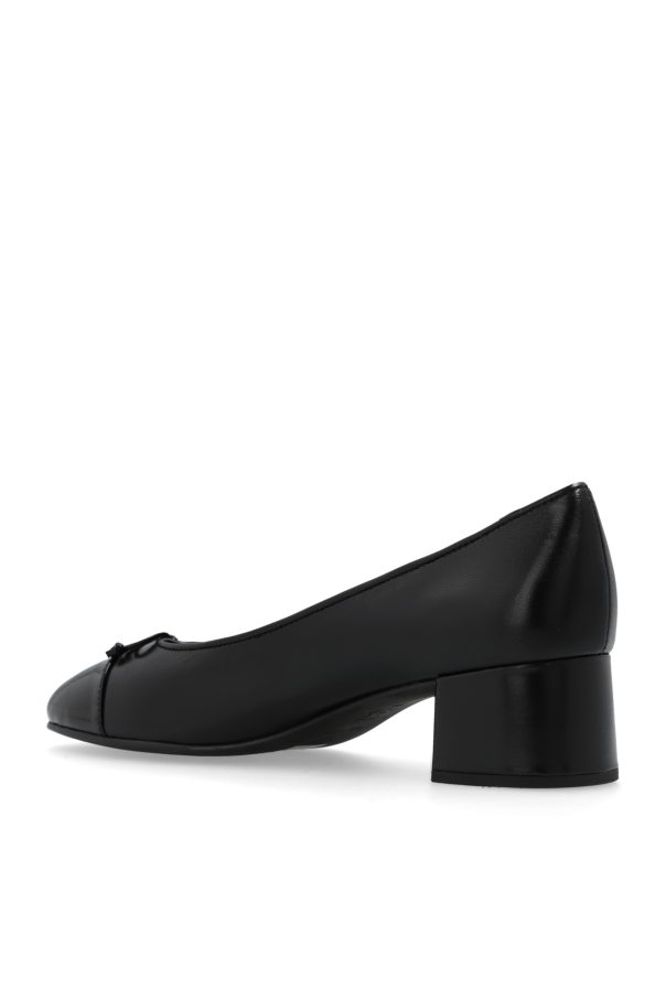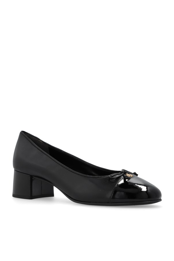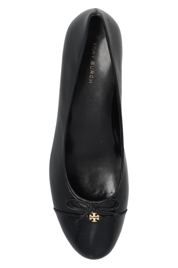 Black ‘Cap -Toe’ pumps from Tory Burch. Made of smooth leather, this pair features a rounded toe with a patent leather toe cap, decorative bow, gold-tone logo detail and black leather sole.