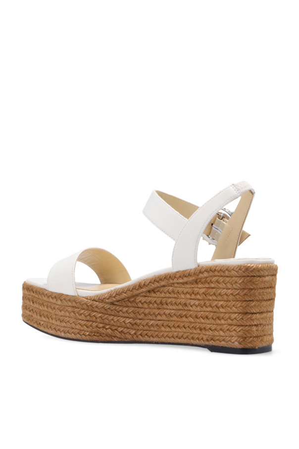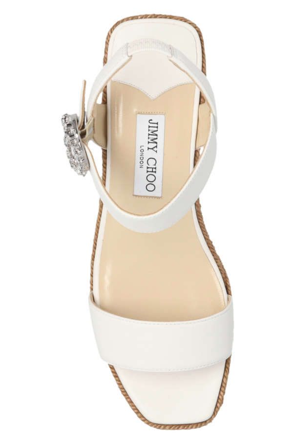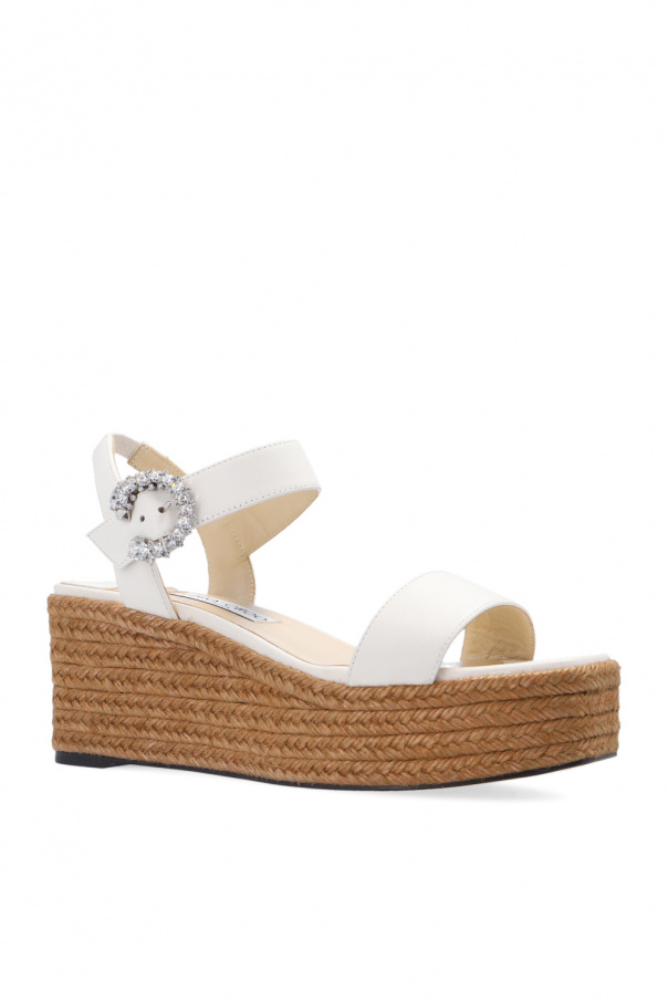 Cream and brown ‘Mirabelle’ wedge sandals from Jimmy Choo. Made of suede, this model features a bejewelled buckle strap, a jute-trimmed wedge and a beige and dark brown sole in leather and rubber.