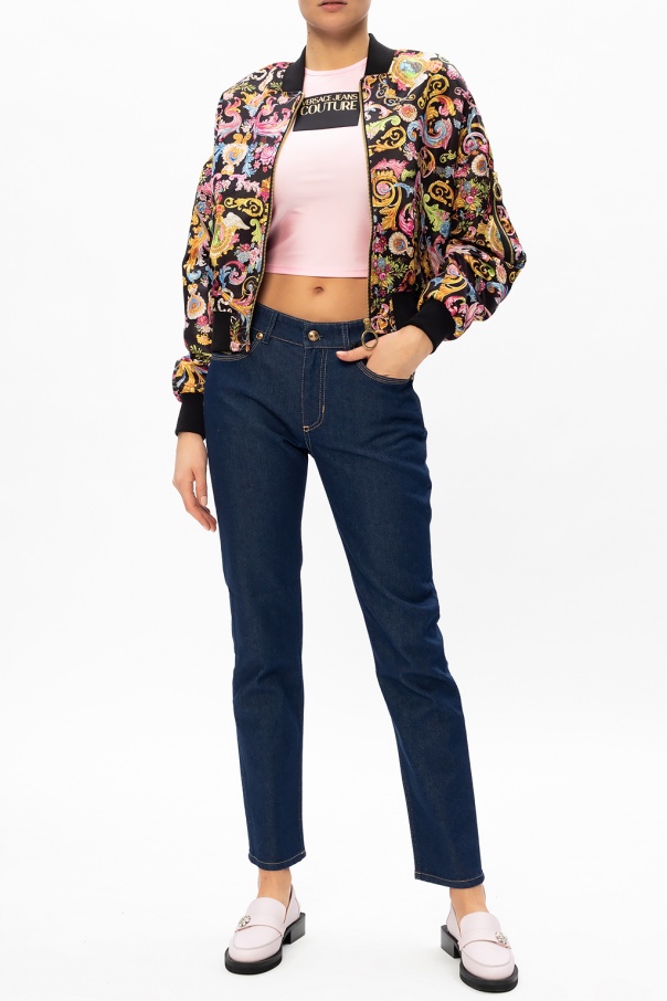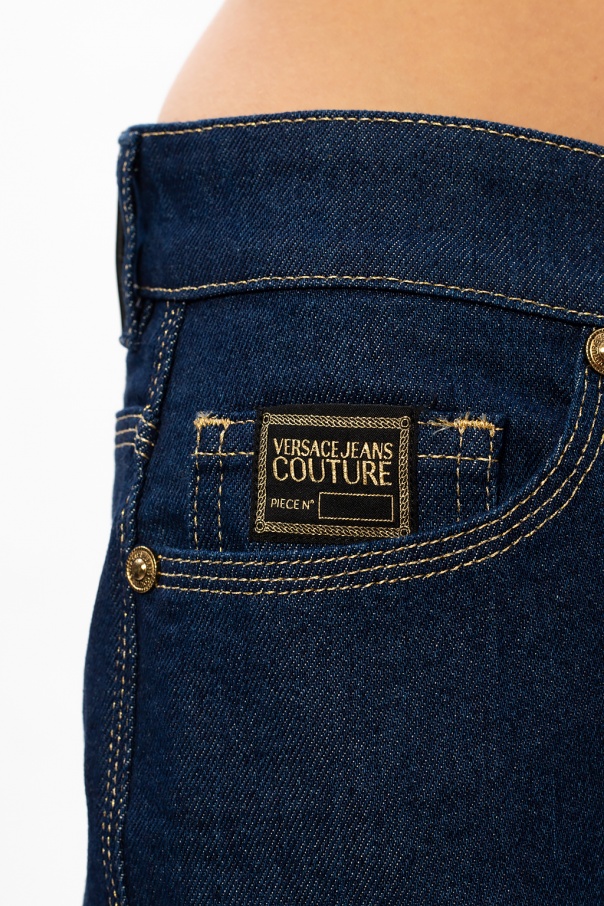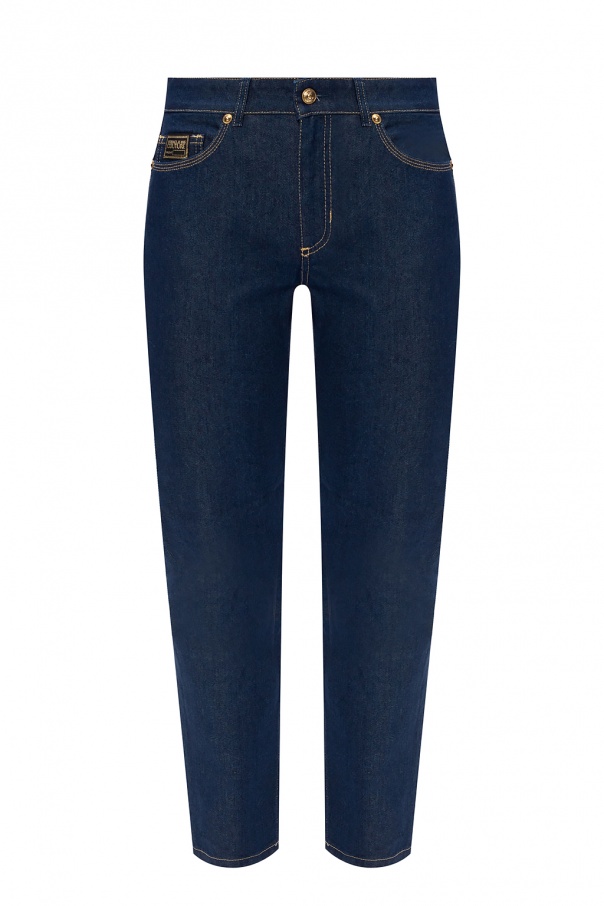Dark blue jeans from Versace Jeans Couture. Fastened with a zip and buttons, this tapered leg design features a logo appliqué at the back, two front pockets and two back pockets.