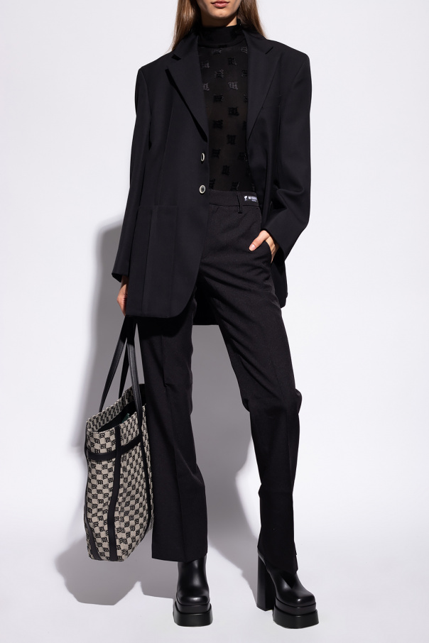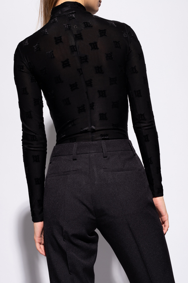 Black ‘Monogram’ bodysuit with a mock neck from MISBHV. Enriched by a velour-flocked logo pattern, this style features a zip fastening, long sleeves and snap closures on the bottom.