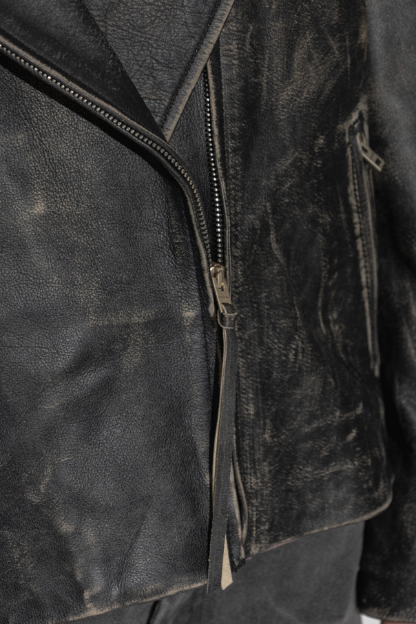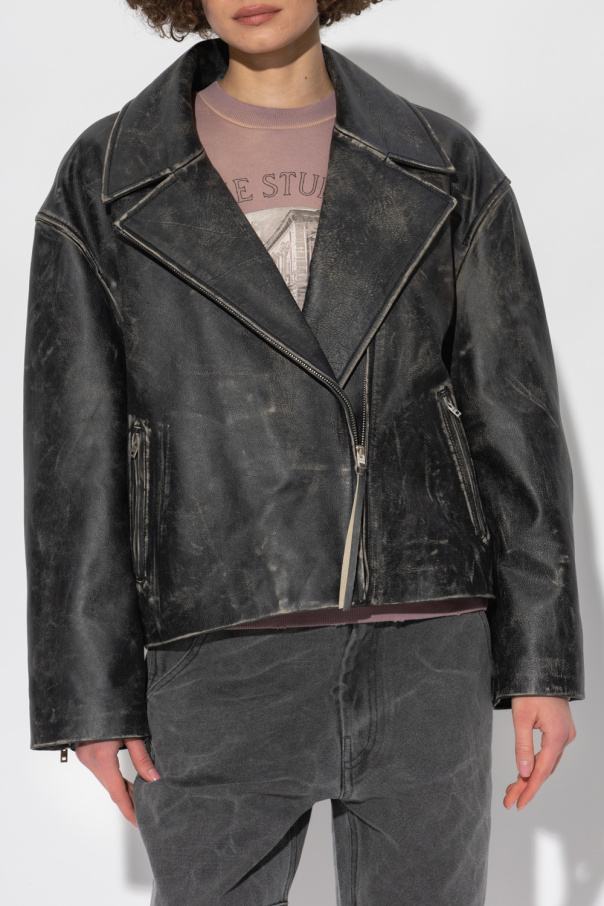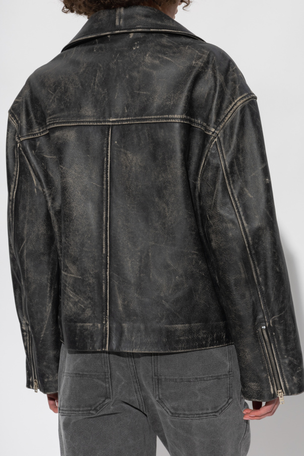 Black biker jacket from Acne Studios. Crafted from distressed leather with a relaxed fit, this style fastens with a zipper and features an oversized lapel collar, two zip pockets and long sleeves with zipped cuffs.