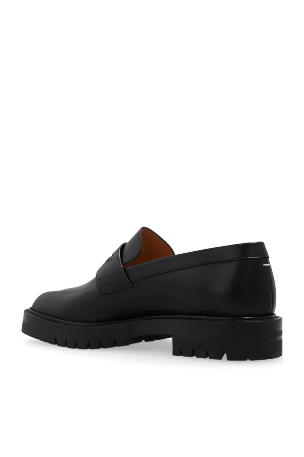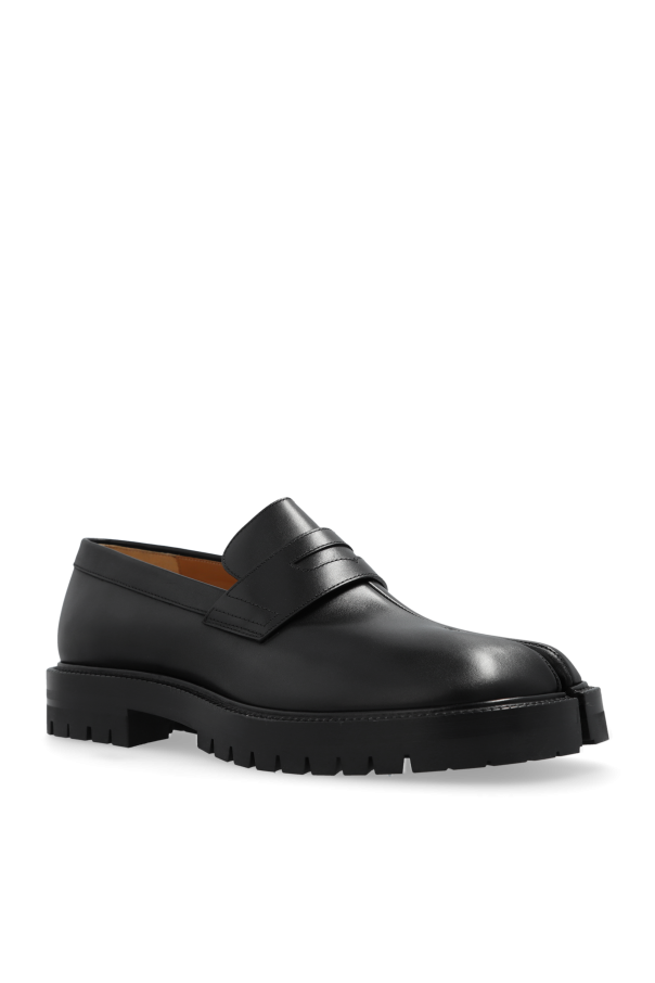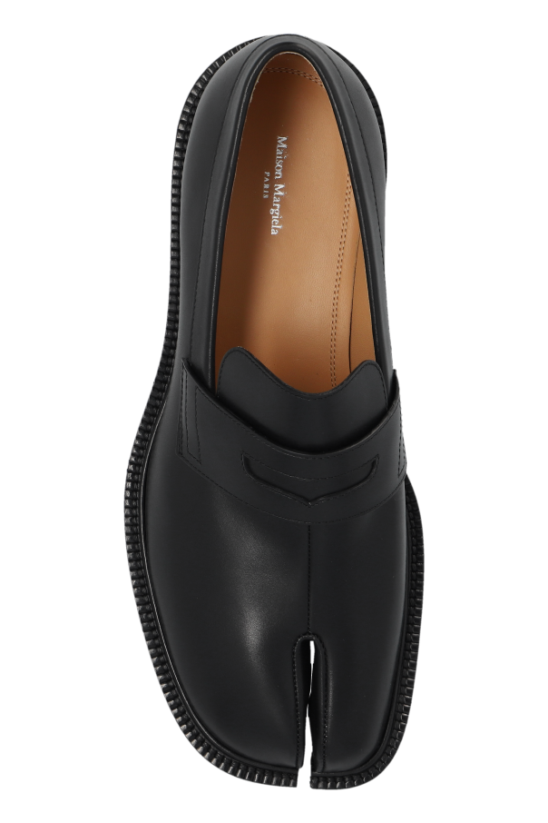 Introducing the exclusive ‘Tabi’ Loafers from the distinguished house of Maison Margiela. These sophisticated men\'s shoes epitomize the perfect amalgamation of classical elegance and avant-garde flair, making them an indispensable addition to any modern gentleman\'s wardrobe. Crafted from premium black leather, these loafers boast a smooth and uniform finish. The interior is lined with a natural, light brown leather insole, enhancing both comfort and sophistication. The ‘Tabi’ Loafers feature a distinctive split-toe design, reminiscent of traditional Japanese footwear, setting them apart from conventional loafers. Key characteristics include a durable, thick sole with a pronounced tread pattern for optimal grip, and a classic leather strap across the vamp. The visible stitching along the edge of the sole not only adds to the shoe\'s robustness but also accentuates its stylish appeal. The inscribed \"Maison Margiela\" within the shoe confirms its elite status. Why Choose This Product? Unique Design: The split-toe ‘Tabi’ design offers a distinctive and avant-garde aesthetic. Luxurious Materials: Made from high-quality black leather, both inside and out. Exceptional Comfort: The light brown leather insole ensures a comfortable and elegant fit. Renowned Brand: Designed by the illustrious Maison Margiela, known for its innovative and unconventional approach to fashion. Durability: Thick sole with a pronounced tread for excellent traction and longevity.