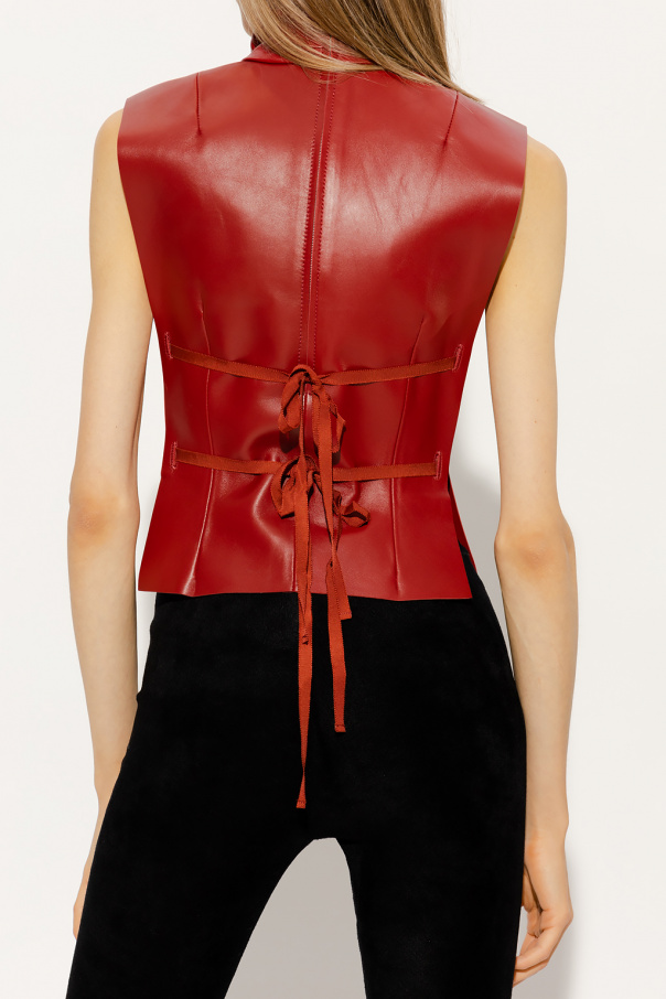 Red sleeveless top from Dries Van Noten. Crafted from leather, this garment features a back zip, drawstrings, side vents and stand collar.