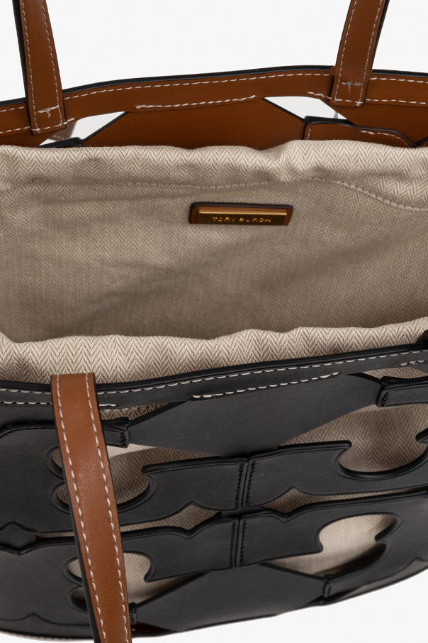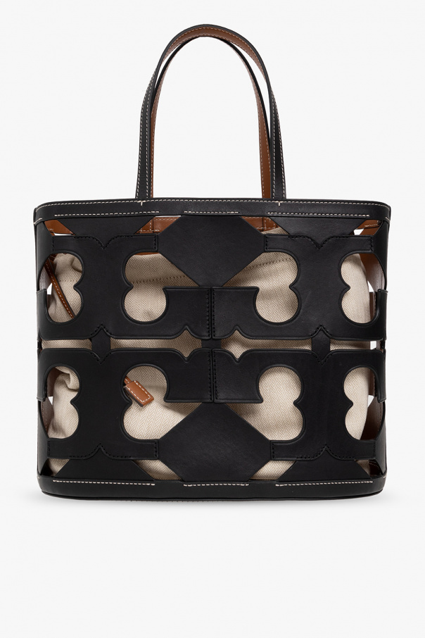 Black and brown ‘Ella Small’ shopper bag from Tory Burch. Crafted from leather with a perforated logo, this model is complete with two half-round handles, cream and beige removable lining with a herringbone pattern as well as gold-tone metal hardware.
