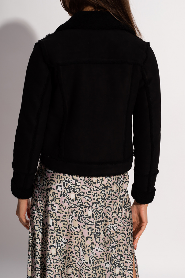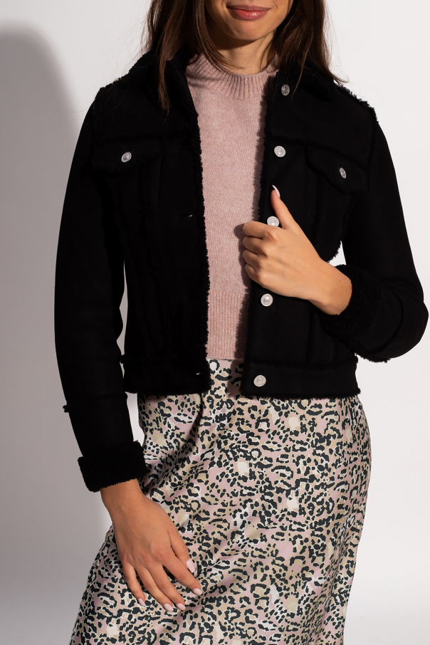 Black ‘Kingsly’ shearling jacket from AllSaints. Crafted from lamb leather, this style features silver-tone button closures and two button pockets.