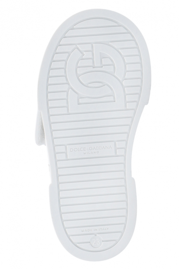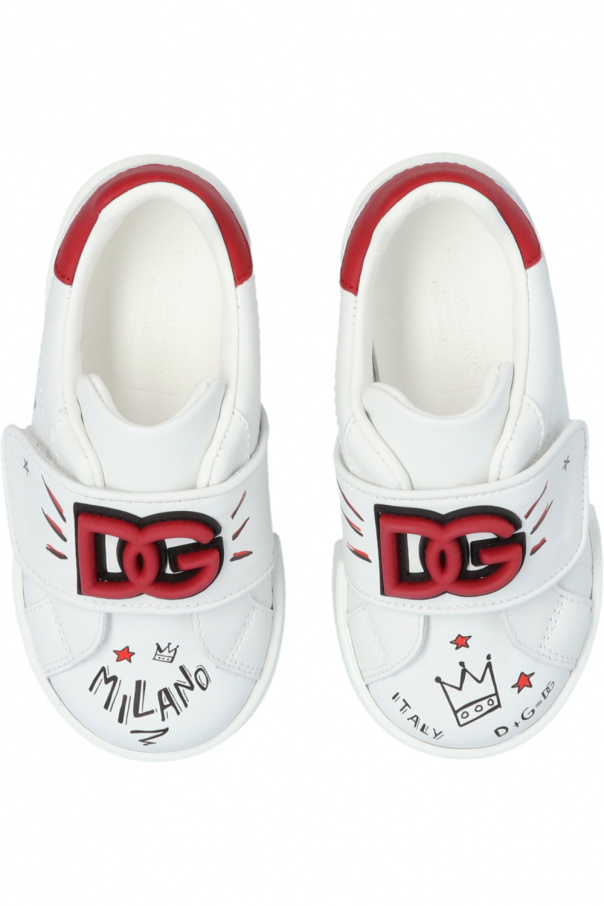 White and red ‘Portofino Light’ sneakers from Dolce & Gabbana Kids. Made of calf leather, this model features a velcro fastener, a rubber monogram appliqué, a red and black graphic print and a white rubber sole. Included cream protective case with a zipper.