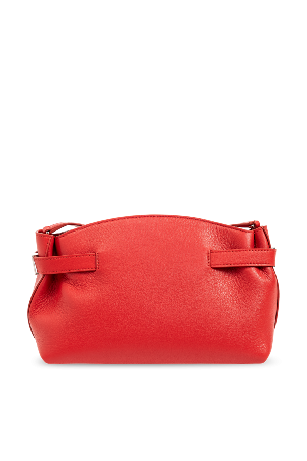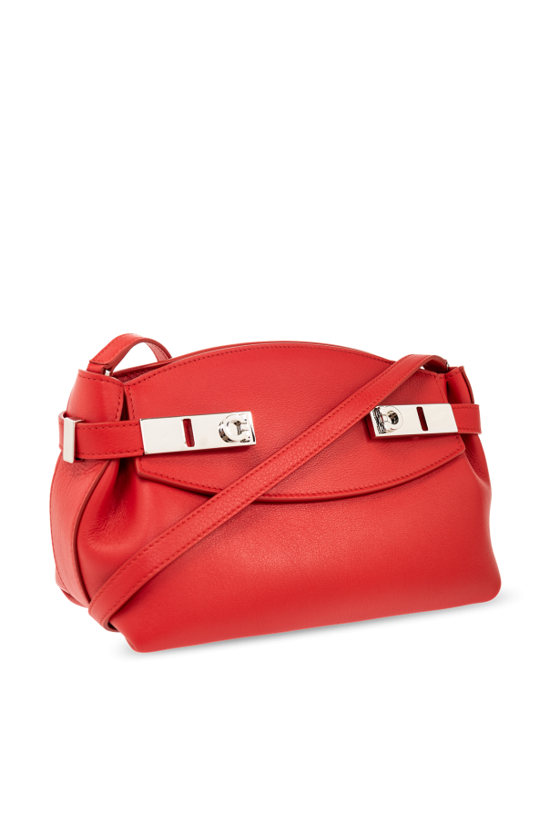 Red ‘Hug’ shoulder bag from FERRAGAMO. Crafted from calf leather, this design features a magnetic snap, decorative straps with the brand’s signature Gancini logo, embossed logo in silver-tone on the side, detachable and adjustable shoulder strap, silver-tone metal hardware and one internal compartment with two card slots.