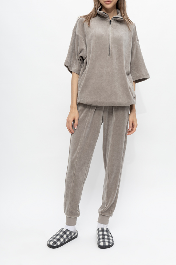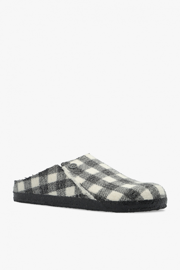 White and grey ‘Zermatt’ slides from Birkenstock. With a wool felt upper, this model features an all-over check pattern, an antiqued silver-tone logo plaque on the front, an embroidered logo, a soft lamb fur lining in cream, an anatomically shaped cork-latex footbed and a black rubber outsole. Narrow width.