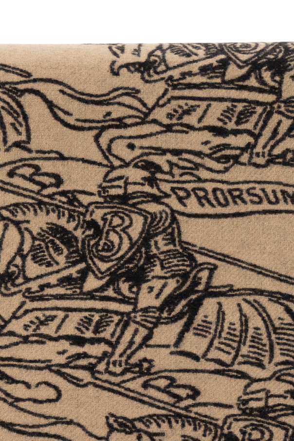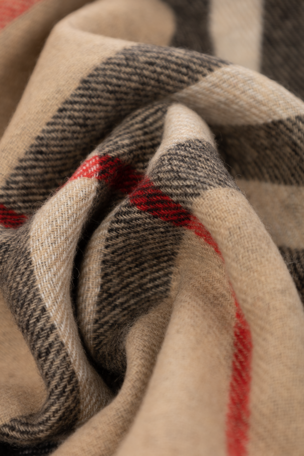 Reversible scarf in beige from Burberry. Made of cashmere, this item features fringed borders. One side showcases a multicoloured check pattern, the other one has a black ‘Equestrian Knight’ logo motif.