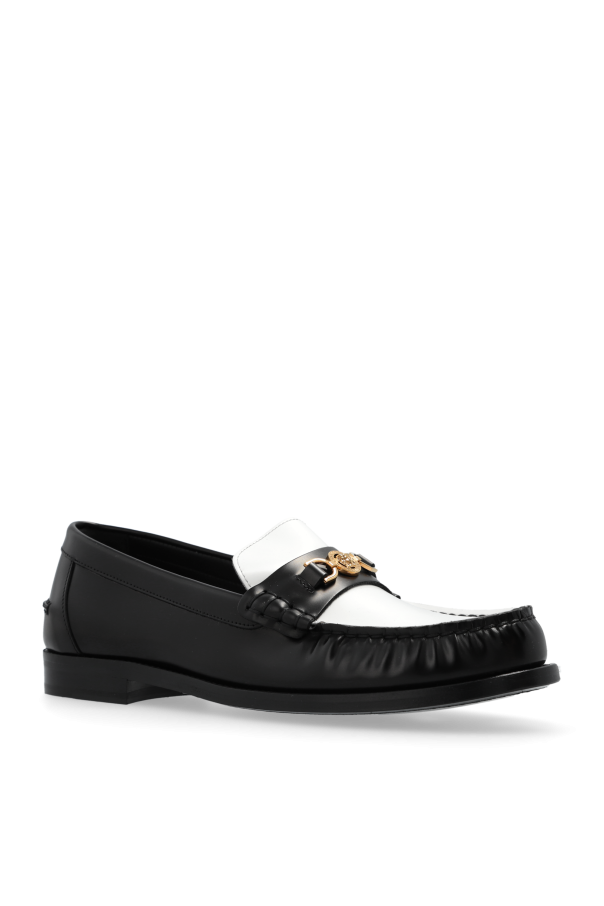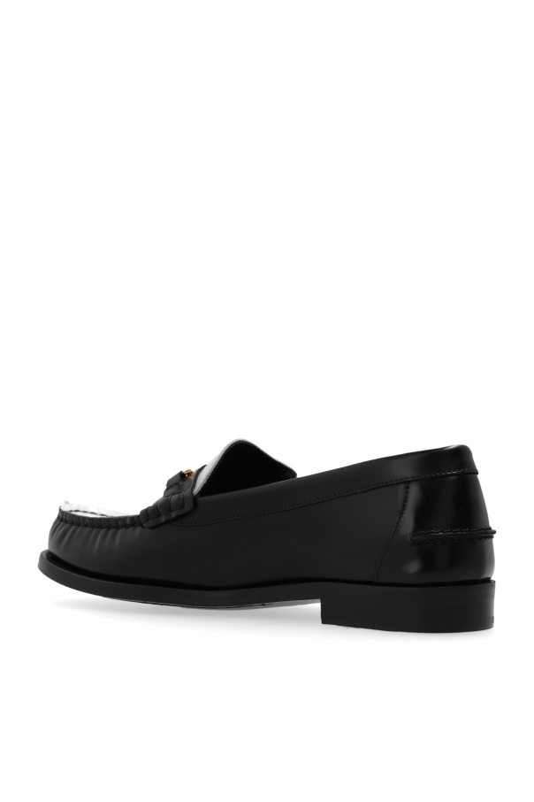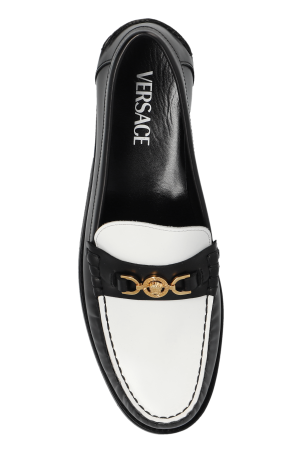 Introducing the exquisite Medusa \'95 loafers from Versace\'s exclusive collection, a paragon of sophistication and modern flair. These loafers epitomize timeless elegance with their classic shape, featuring rounded toes and a low heel, seamlessly blending tradition with contemporary design. Crafted from the finest quality leather, the Medusa \'95 loafers boast a dominantly black hue, accentuated by contrasting white inserts at the front. The meticulous white stitching on the white part of the shoe adds an extra touch of refinement and elegance. Distinguished by a signature golden Medusa embellishment on the front, these loafers are instantly recognizable and exude opulence. The interior showcases a prominently displayed Versace logo, underscoring the exclusivity of the product. Styled effortlessly with black leather pants and a black sweater, as depicted in the accompanying images, these loafers reinforce their status as a quintessential piece for any discerning wardrobe. Why Choose This Product? Unparalleled craftsmanship using high-quality leather for both exterior and interior. Iconic golden Medusa embellishment, a hallmark of Versace\'s luxurious design. Elegant color contrast with meticulous white stitching, offering a unique and sophisticated look. Exclusive Versace branding, ensuring authenticity and prestige.