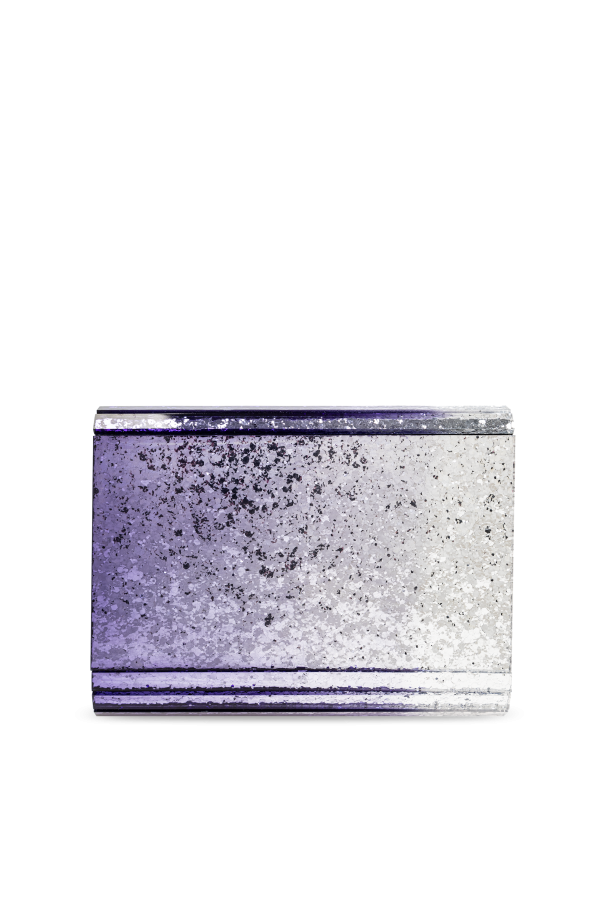Introducing the \'Candy\' Clutch by Jimmy Choo, a masterpiece that encapsulates the essence of luxury and modernity. This exclusive accessory, from its enchanting violet to nearly silver color transitions, is adorned with a shimmering, glittering surface that catches and reflects light, creating a captivating glamour effect. The clutch\'s rectangular shape and multi-layered angles add a geometric depth to its design, further accentuated by the iconic designer logo prominently displayed on its facade. Crafted from premium acrylic and leather materials, the \'Candy\' Clutch is not only visually stunning but also practical. It features a versatile chain strap that can be elegantly draped over the shoulder or tucked inside, transforming the clutch to suit your style or occasion. The interior reveals a thoughtfully organized compartment, including a slip pocket for cards, ensuring functionality amidst its aesthetic allure. Secured with a magnetic snap closure, this clutch is an exemplary accessory to complement wide-legged trousers, bridging elegance with contemporary fashion sensibilities. Why Purchase the \'Candy\' Clutch? Elegance and modernity combined in a single accessory Luxurious materials and unique design by Jimmy Choo Versatile chain strap for multiple styling options Functional interior with practical pocket arrangement Secured with a reliable magnetic snap closure