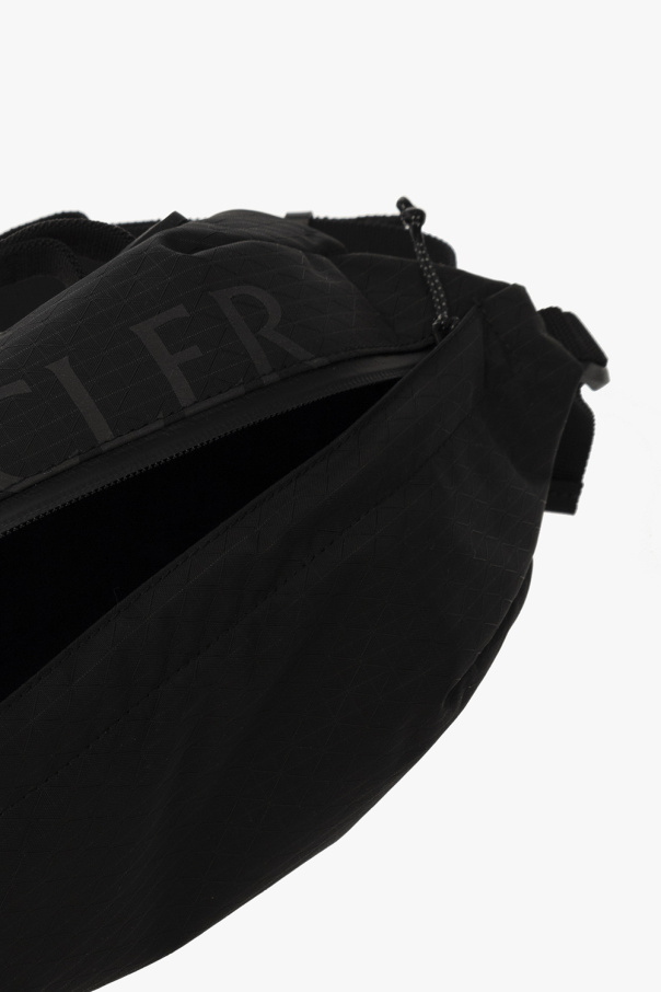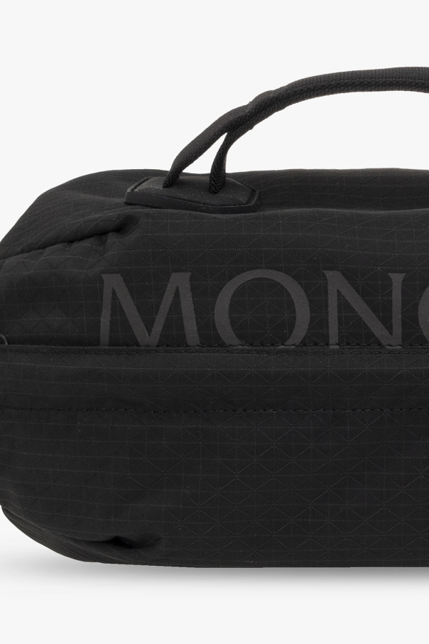 Black 'Alchemy' belt bag from Moncler. Crafted from textured material, this design secures with a two-way zipper and showcases a black logo print on the front, an adjustable strap and one internal compartment.