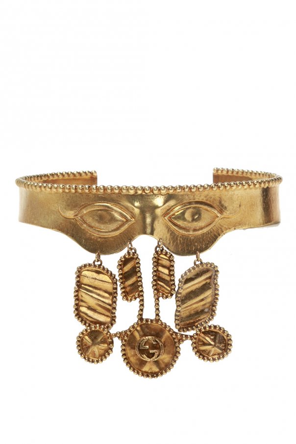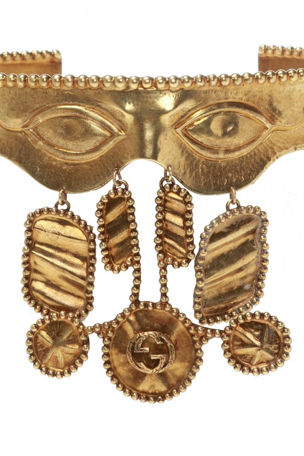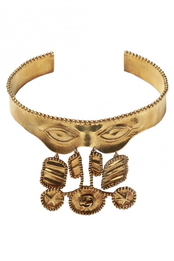 Metal antiqued gold-tone choker from Gucci embellished with decorative charms and logo detail.